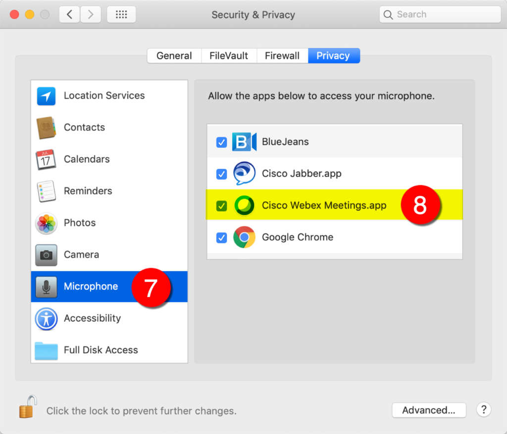 8). Make sure Cisco Webex Meetings.app is check marked in the list.