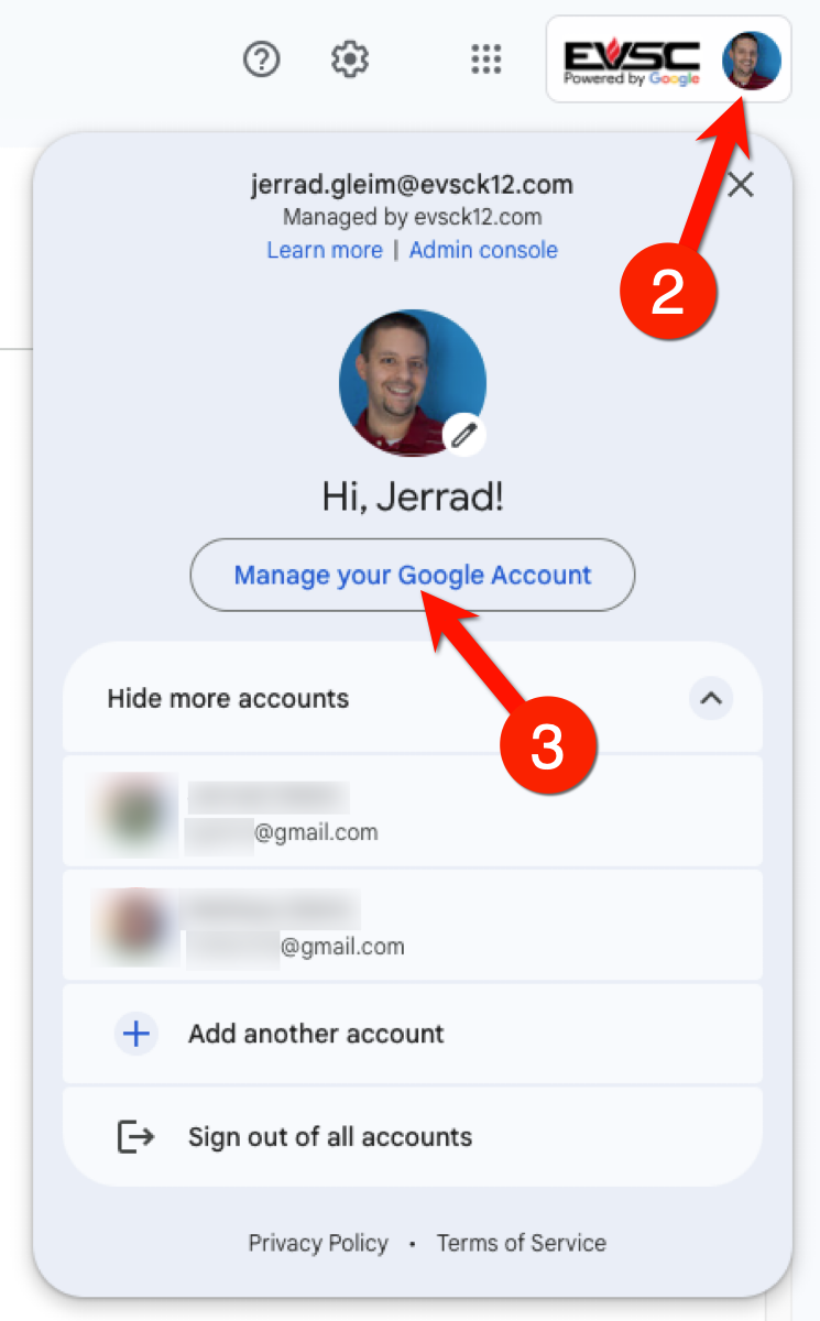 Since the EVSC’s Google Suite has unlimited storage, you may not be able to transfer all of your data to a free public Google account. Public Google accounts have a limited storage capacity of 15GB. Public accounts can extend their storage limit by paying a monthly fee.