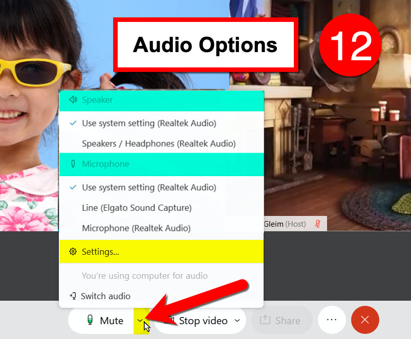 From this menu, you can select different speaker and microphone options (if available), view Audio Settings, and change from Computer Audio to Call-in Audio.