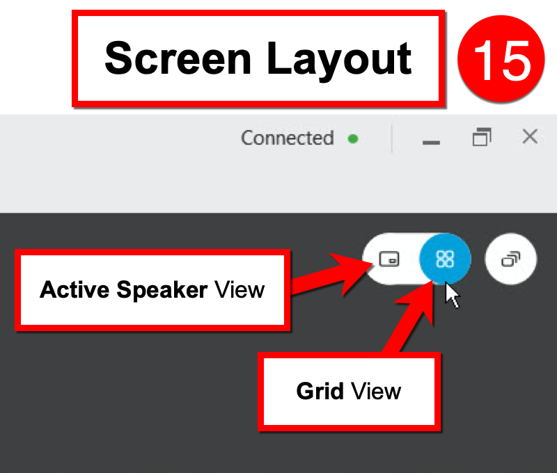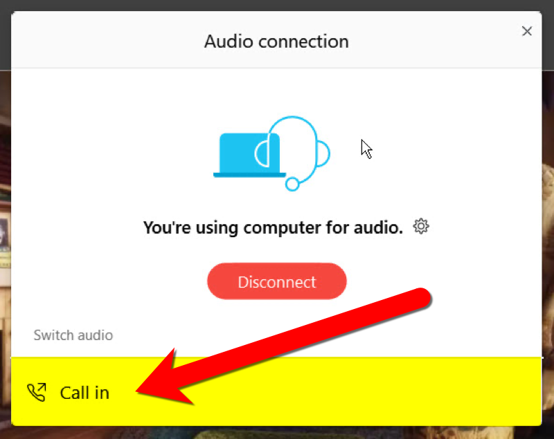 CHANGE AUDIO CONNECTION – Where you can switch from using Internet for Audio to Call In using a telephone.