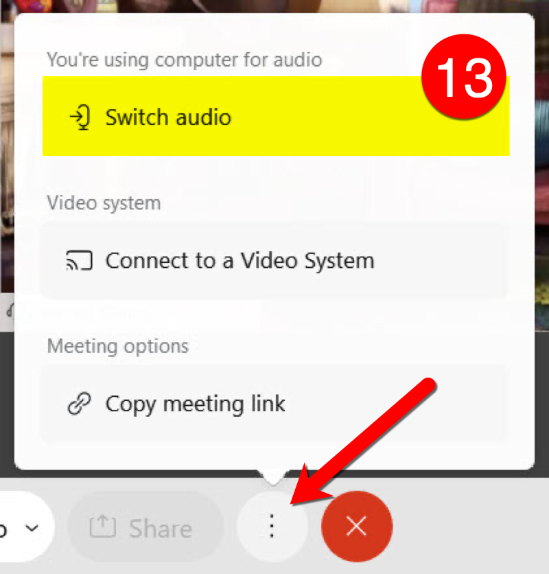 Select More Options to Switch Audio or Copy the Meeting Link.