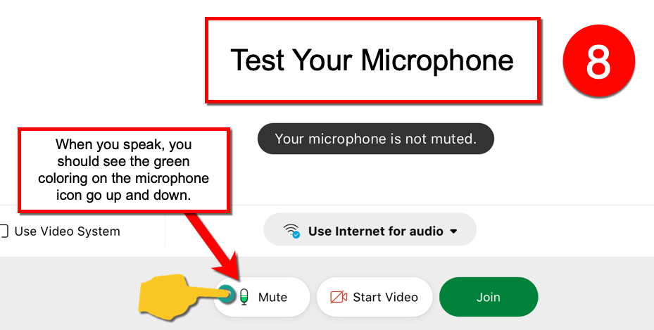 8). Test the Microphone. You should see green coloring moving up and down inside the microphone icon as you speak.