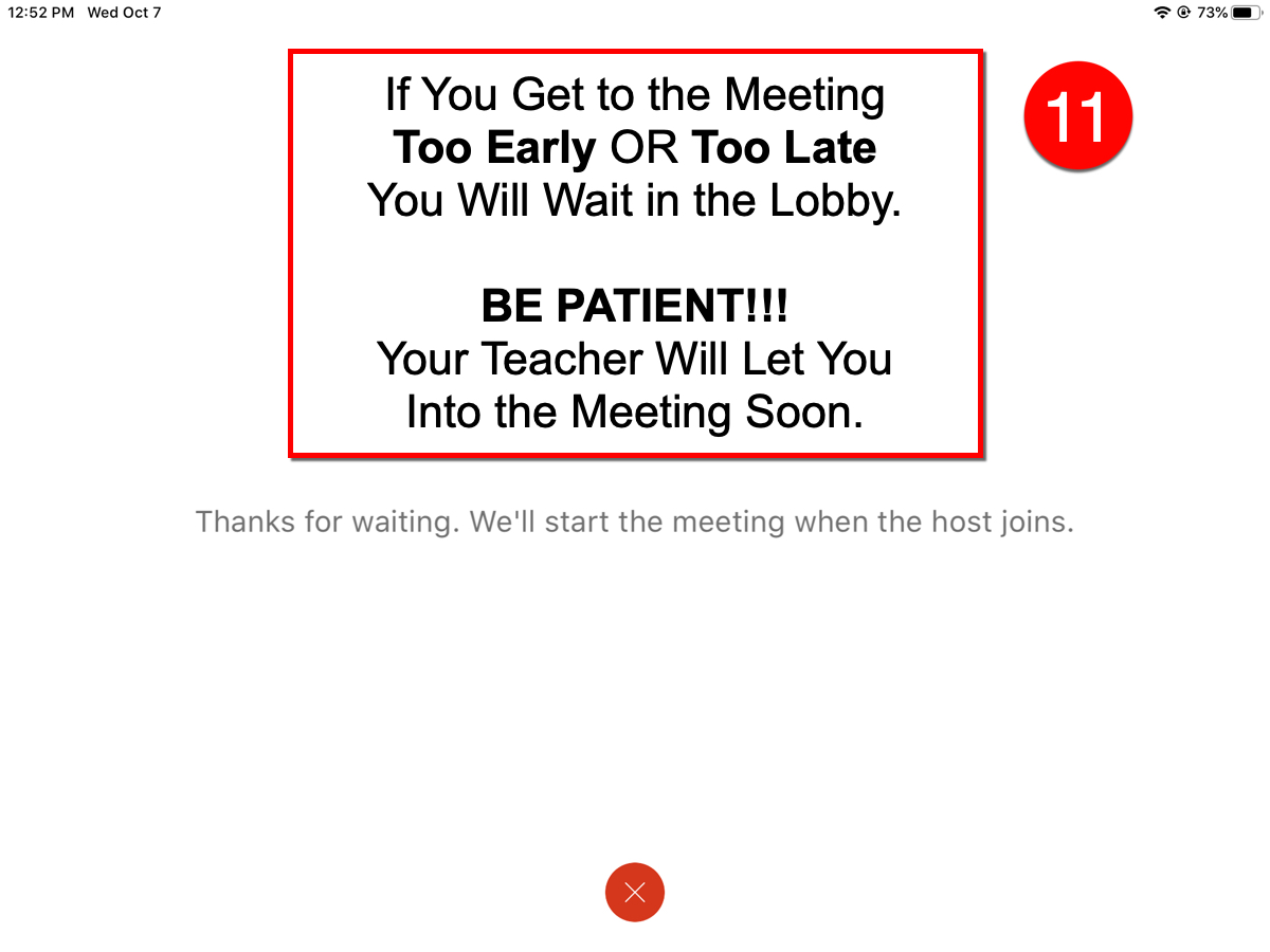11). If you get to the meeting Too Early OR Too Late, you will need to wait in the Meeting Lobby. The Teacher will admit you to the meeting when they start the meeting or when they see you’re waiting in the Participants panel.